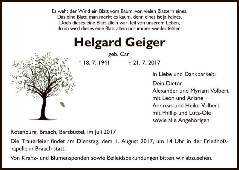 Hier finden Sie alle Traueranzeigen aus der Zeitung, die bisher für Helgard Geiger erschienen sind. Weitere Traueranzeigen, die in der Zeitung erscheinen, werden hier ebenfalls aufgelistet