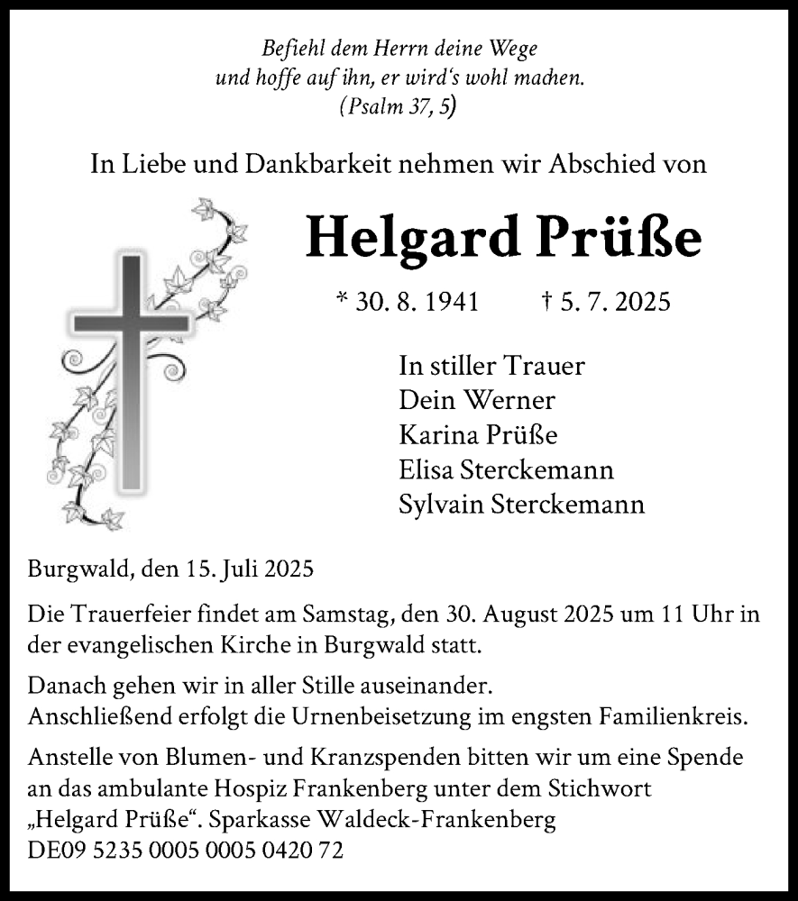 Hier finden Sie alle Traueranzeigen aus der Zeitung, die bisher für Helgard Prüße erschienen sind. Weitere Traueranzeigen, die in der Zeitung erscheinen, werden hier ebenfalls aufgelistet