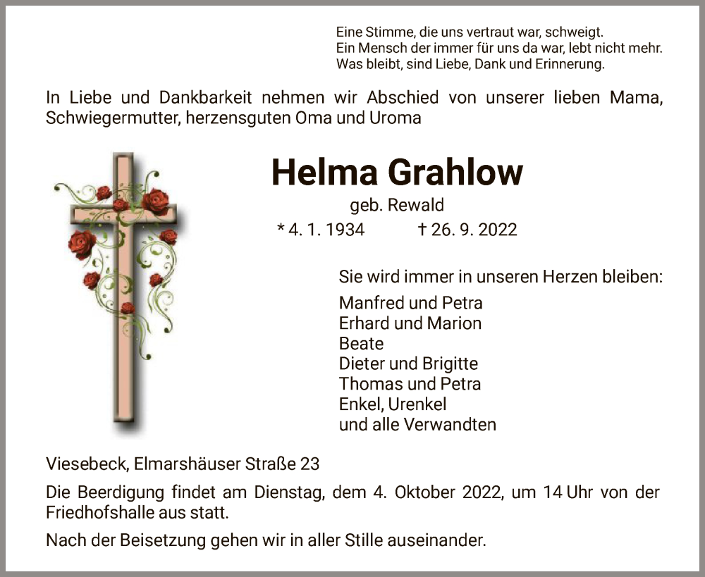Hier finden Sie alle Traueranzeigen aus der Zeitung, die bisher für Helma Grahlow erschienen sind. Weitere Traueranzeigen, die in der Zeitung erscheinen, werden hier ebenfalls aufgelistet