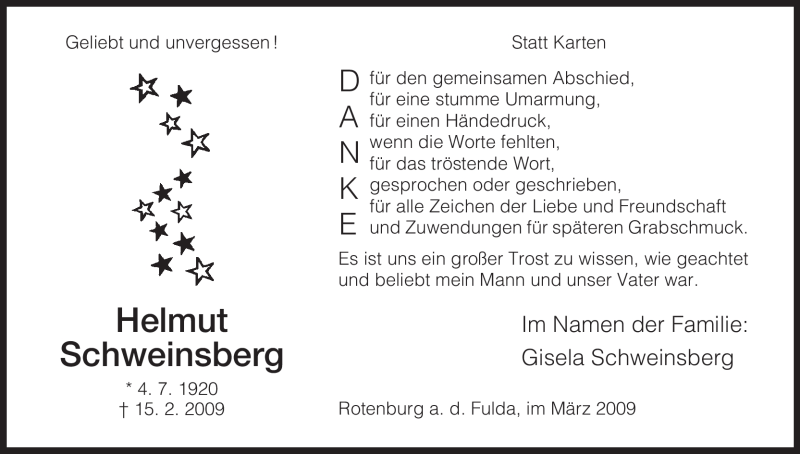 Hier finden Sie alle Traueranzeigen aus der Zeitung, die bisher für Helmut Schweinsberg erschienen sind. Weitere Traueranzeigen, die in der Zeitung erscheinen, werden hier ebenfalls aufgelistet