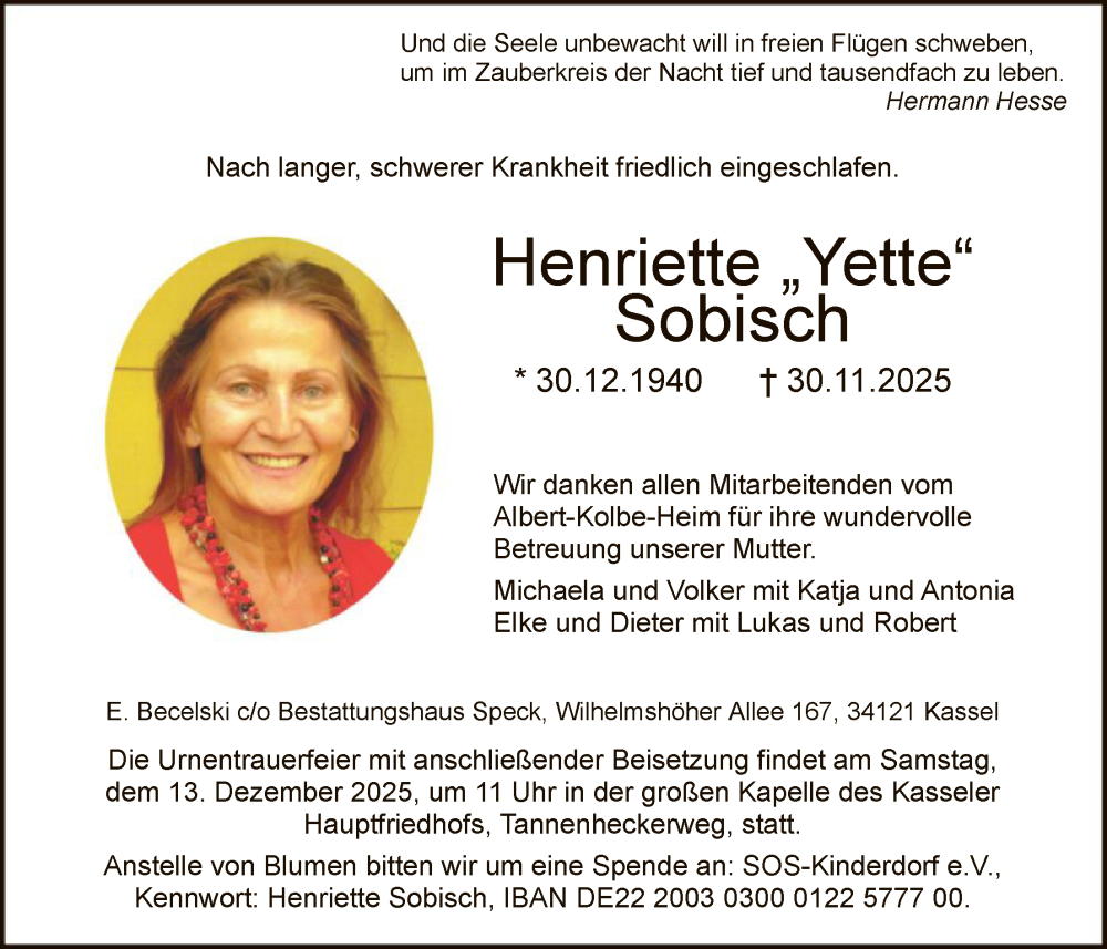 Hier finden Sie alle Traueranzeigen aus der Zeitung, die bisher für Henriette Sobisch erschienen sind. Weitere Traueranzeigen, die in der Zeitung erscheinen, werden hier ebenfalls aufgelistet