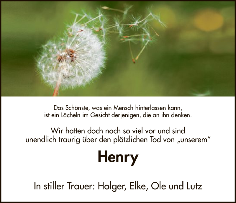 Hier finden Sie alle Traueranzeigen aus der Zeitung, die bisher für Henry erschienen sind. Weitere Traueranzeigen, die in der Zeitung erscheinen, werden hier ebenfalls aufgelistet
