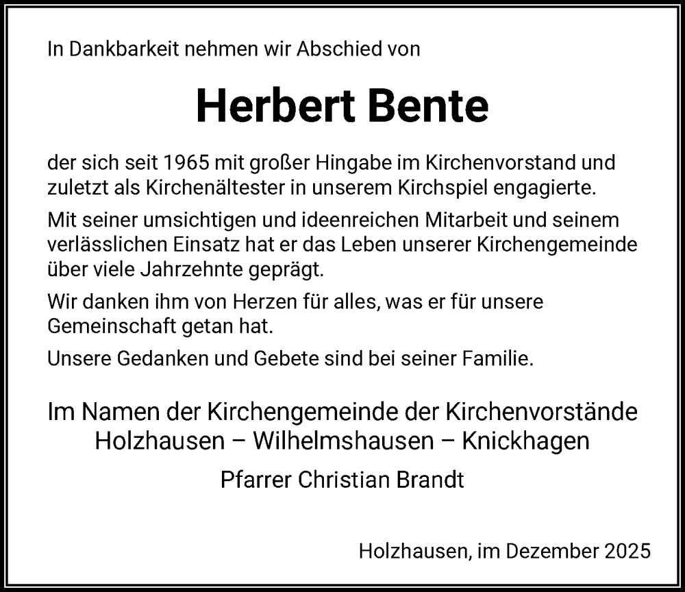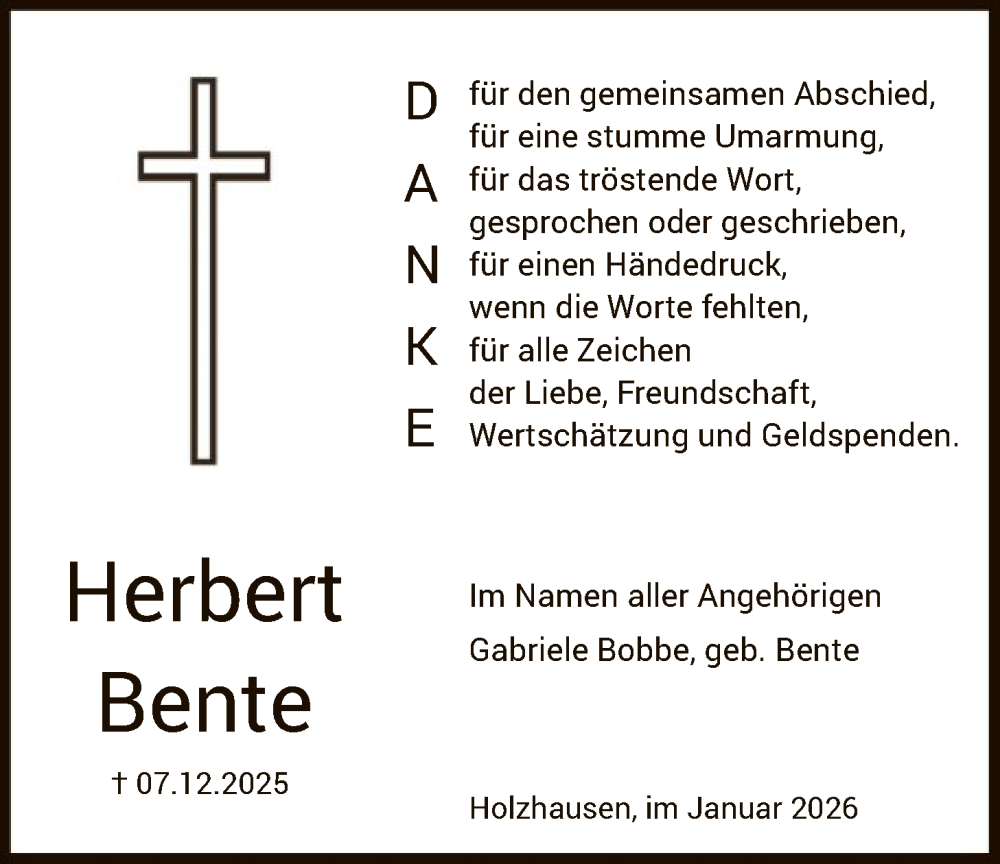 Hier finden Sie alle Traueranzeigen aus der Zeitung, die bisher für Herbert Bente erschienen sind. Weitere Traueranzeigen, die in der Zeitung erscheinen, werden hier ebenfalls aufgelistet