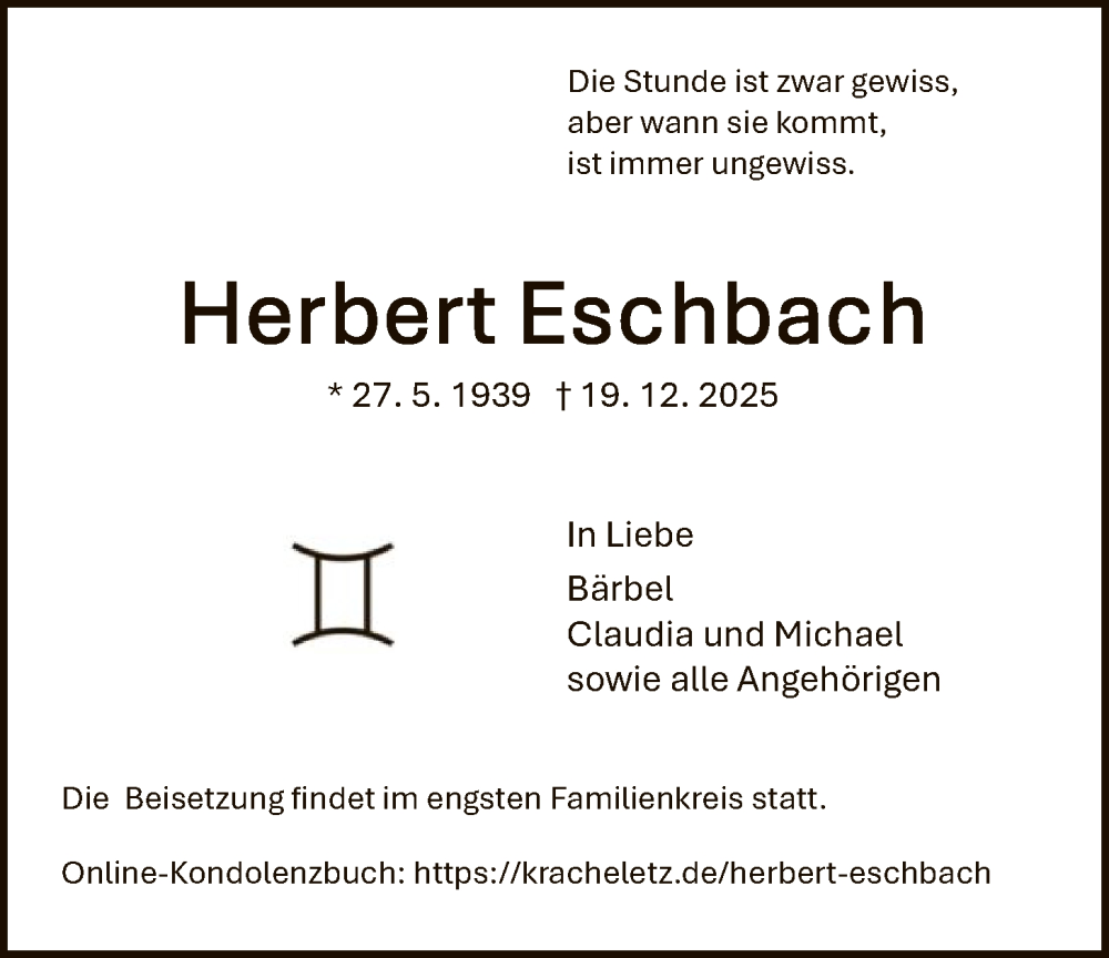 Hier finden Sie alle Traueranzeigen aus der Zeitung, die bisher für Herbert Eschbach erschienen sind. Weitere Traueranzeigen, die in der Zeitung erscheinen, werden hier ebenfalls aufgelistet