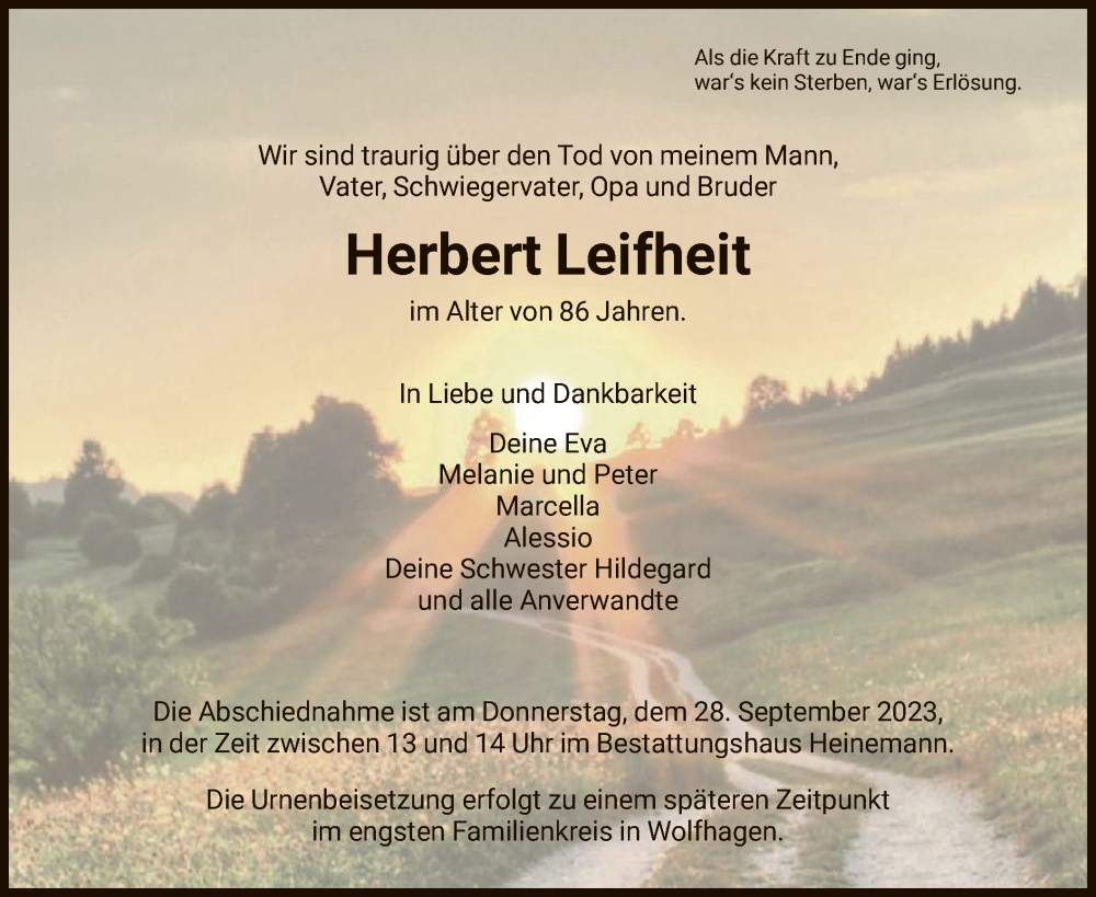 Hier finden Sie alle Traueranzeigen aus der Zeitung, die bisher für Herbert Leifheit erschienen sind. Weitere Traueranzeigen, die in der Zeitung erscheinen, werden hier ebenfalls aufgelistet