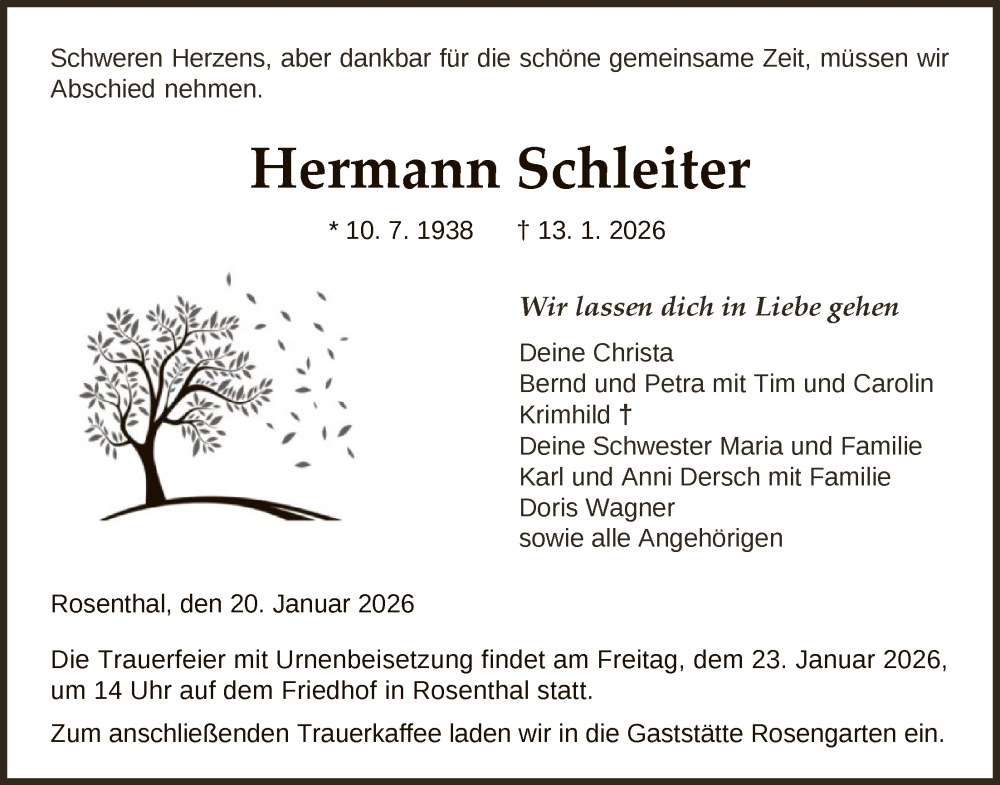 Hier finden Sie alle Traueranzeigen aus der Zeitung, die bisher für Hermann Schleiter erschienen sind. Weitere Traueranzeigen, die in der Zeitung erscheinen, werden hier ebenfalls aufgelistet