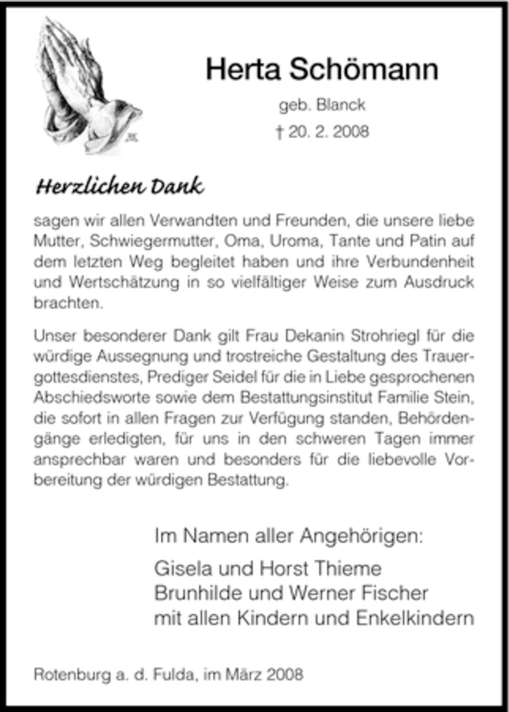 Hier finden Sie alle Traueranzeigen aus der Zeitung, die bisher für Herta Schömann erschienen sind. Weitere Traueranzeigen, die in der Zeitung erscheinen, werden hier ebenfalls aufgelistet