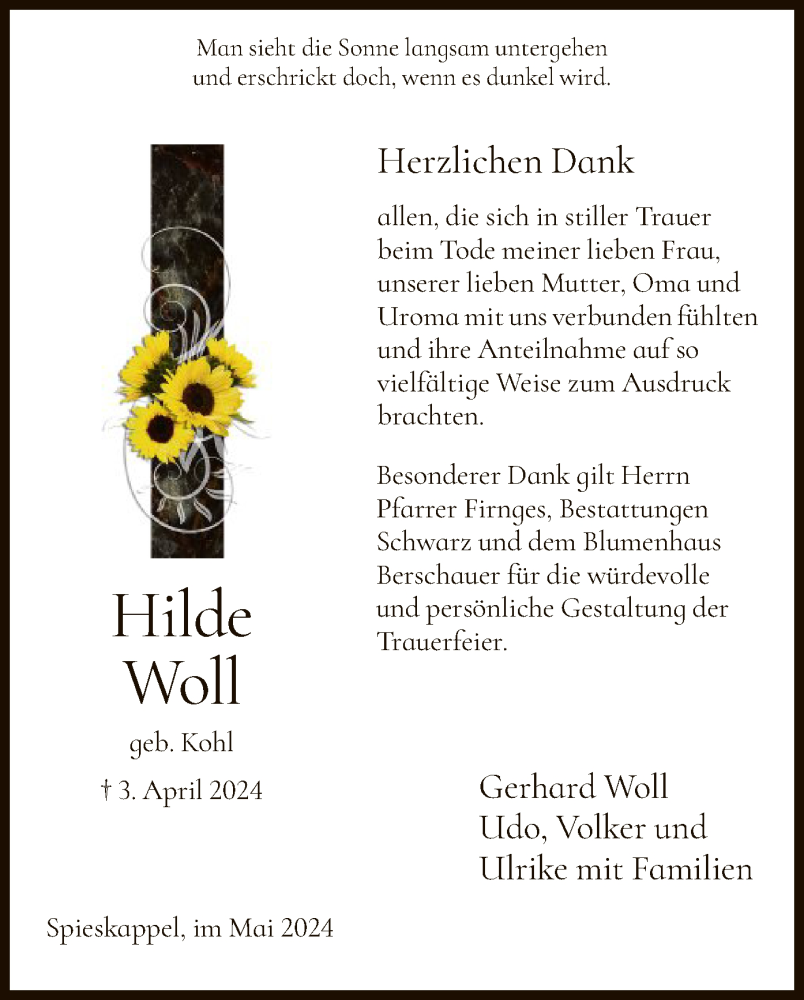 Hier finden Sie alle Traueranzeigen aus der Zeitung, die bisher für Hilde Woll erschienen sind. Weitere Traueranzeigen, die in der Zeitung erscheinen, werden hier ebenfalls aufgelistet