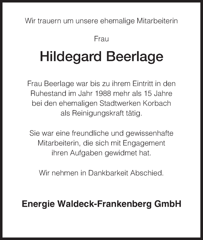 Hier finden Sie alle Traueranzeigen aus der Zeitung, die bisher für Hildegard Beerlage erschienen sind. Weitere Traueranzeigen, die in der Zeitung erscheinen, werden hier ebenfalls aufgelistet