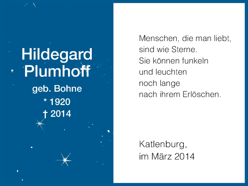Hier finden Sie alle Traueranzeigen aus der Zeitung, die bisher für Hildegard Plumhoff erschienen sind. Weitere Traueranzeigen, die in der Zeitung erscheinen, werden hier ebenfalls aufgelistet