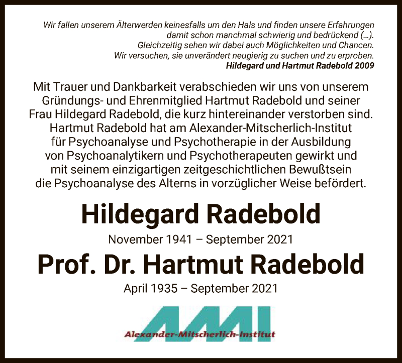 Hier finden Sie alle Traueranzeigen aus der Zeitung, die bisher für Hildegard und Hartmut Radebold erschienen sind. Weitere Traueranzeigen, die in der Zeitung erscheinen, werden hier ebenfalls aufgelistet