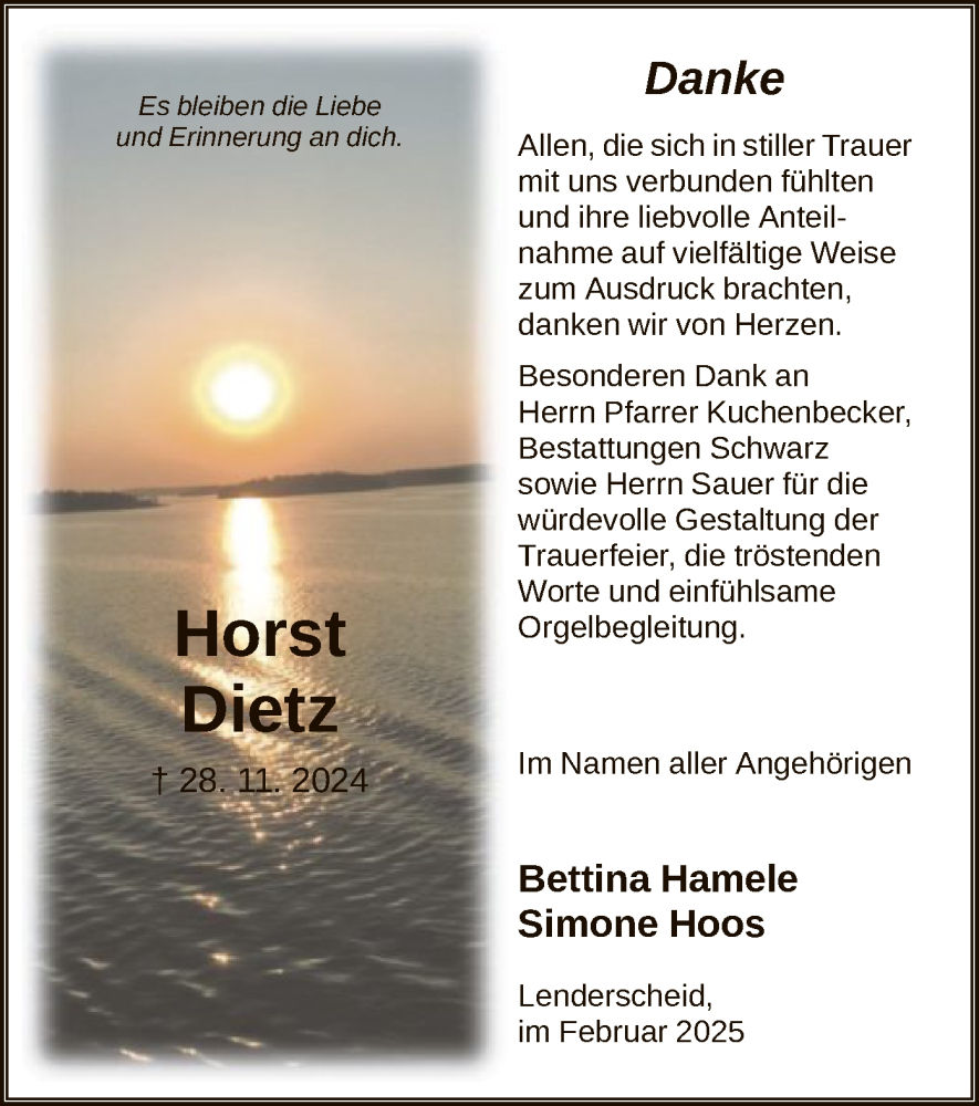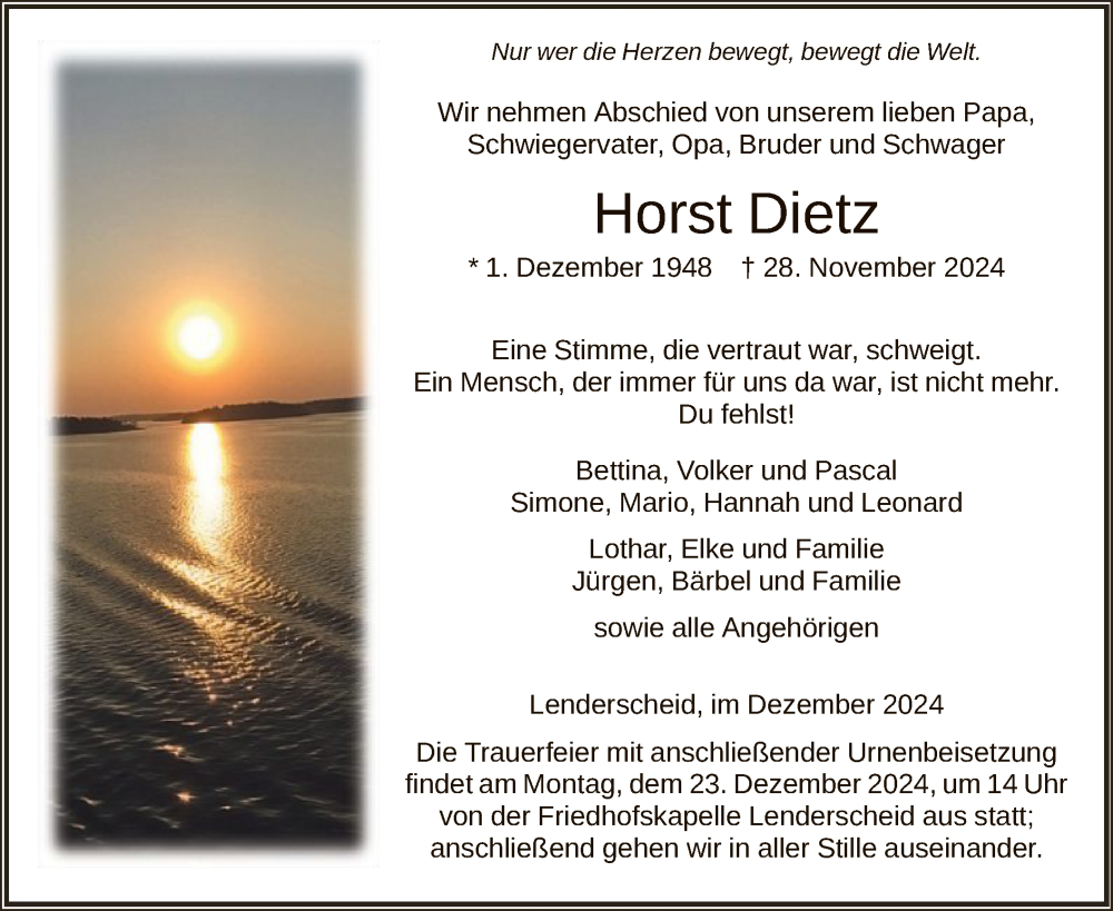 Hier finden Sie alle Traueranzeigen aus der Zeitung, die bisher für Horst Dietz erschienen sind. Weitere Traueranzeigen, die in der Zeitung erscheinen, werden hier ebenfalls aufgelistet