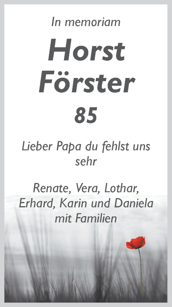 Hier finden Sie alle Traueranzeigen aus der Zeitung, die bisher für Horst Förster erschienen sind. Weitere Traueranzeigen, die in der Zeitung erscheinen, werden hier ebenfalls aufgelistet