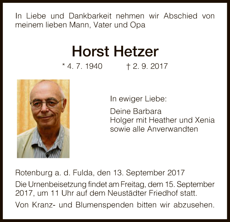 Hier finden Sie alle Traueranzeigen aus der Zeitung, die bisher für Horst Hetzer erschienen sind. Weitere Traueranzeigen, die in der Zeitung erscheinen, werden hier ebenfalls aufgelistet