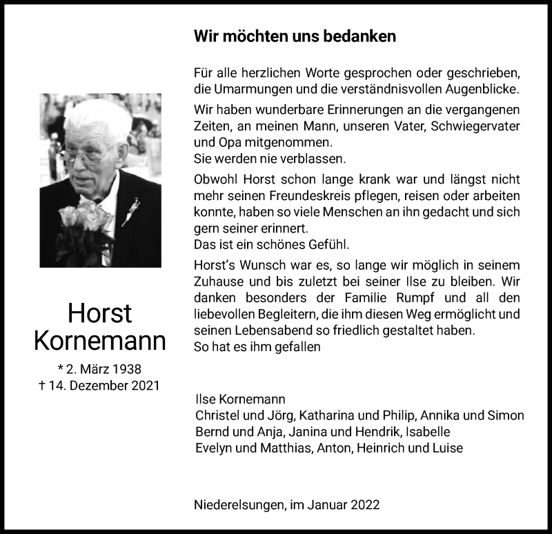 Hier finden Sie alle Traueranzeigen aus der Zeitung, die bisher für Horst Kornemann erschienen sind. Weitere Traueranzeigen, die in der Zeitung erscheinen, werden hier ebenfalls aufgelistet