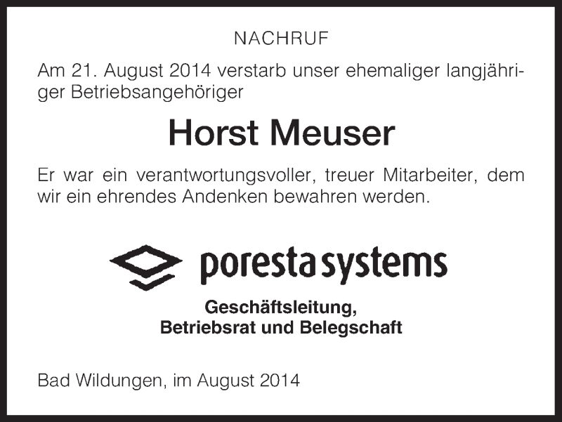 Hier finden Sie alle Traueranzeigen aus der Zeitung, die bisher für Horst Meuser erschienen sind. Weitere Traueranzeigen, die in der Zeitung erscheinen, werden hier ebenfalls aufgelistet