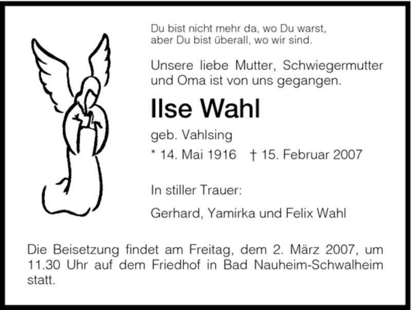 Hier finden Sie alle Traueranzeigen aus der Zeitung, die bisher für Ilse Wahl erschienen sind. Weitere Traueranzeigen, die in der Zeitung erscheinen, werden hier ebenfalls aufgelistet