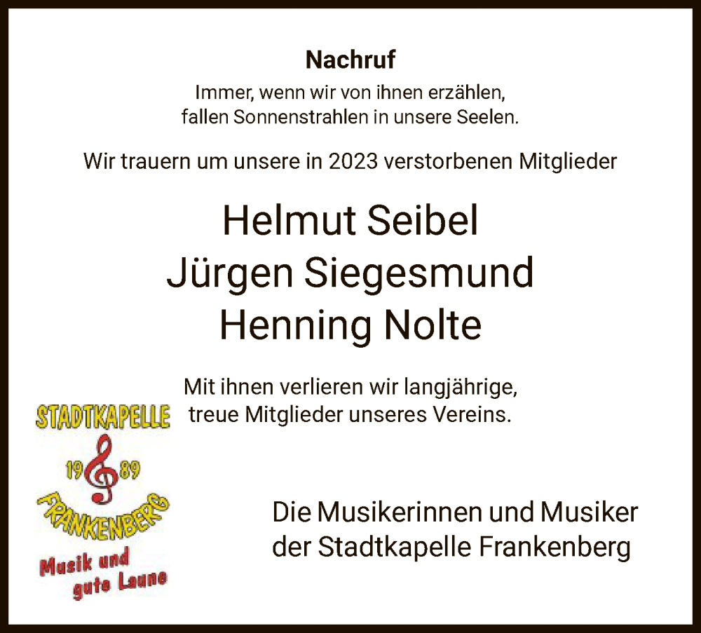Hier finden Sie alle Traueranzeigen aus der Zeitung, die bisher für Im Gedenken 2023 erschienen sind. Weitere Traueranzeigen, die in der Zeitung erscheinen, werden hier ebenfalls aufgelistet