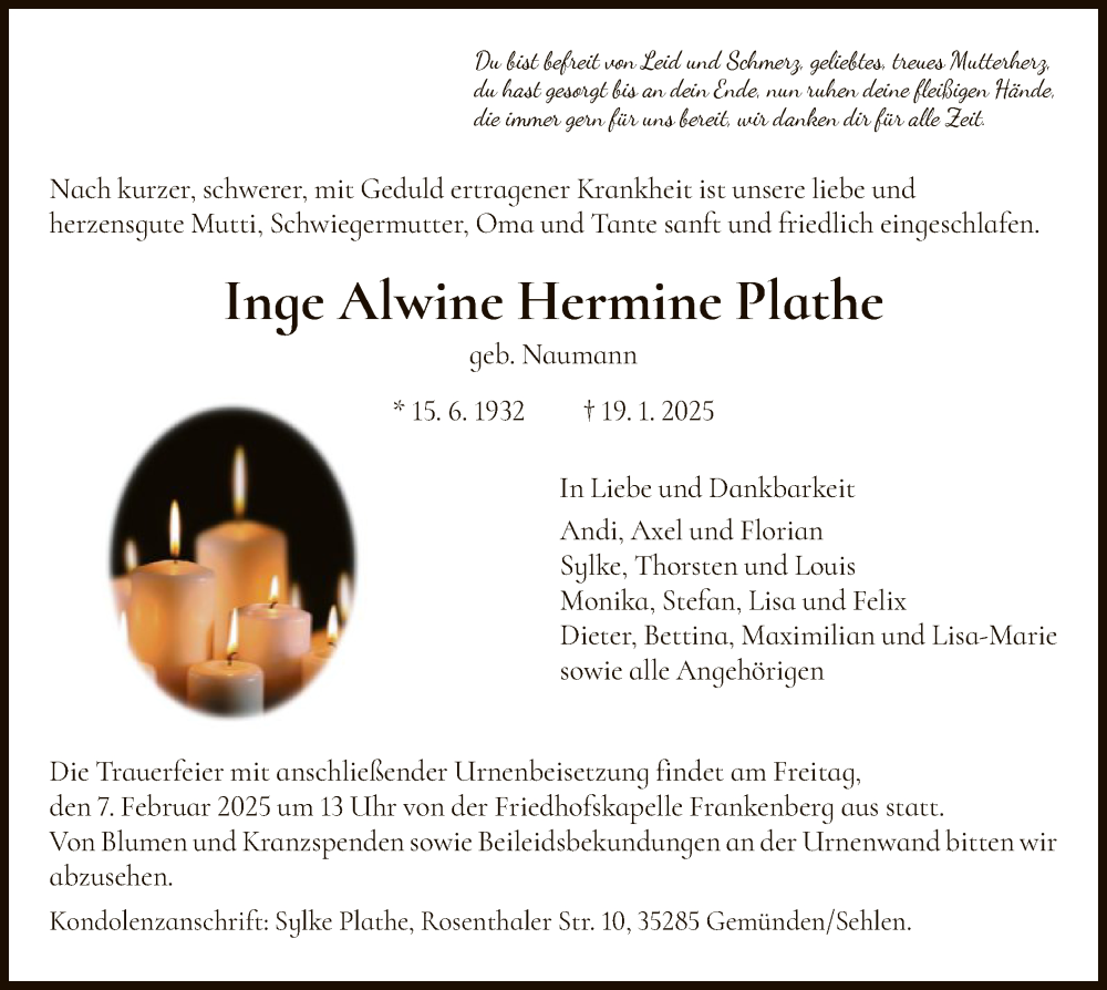 Hier finden Sie alle Traueranzeigen aus der Zeitung, die bisher für Inge Alwine Hermine Plathe erschienen sind. Weitere Traueranzeigen, die in der Zeitung erscheinen, werden hier ebenfalls aufgelistet
