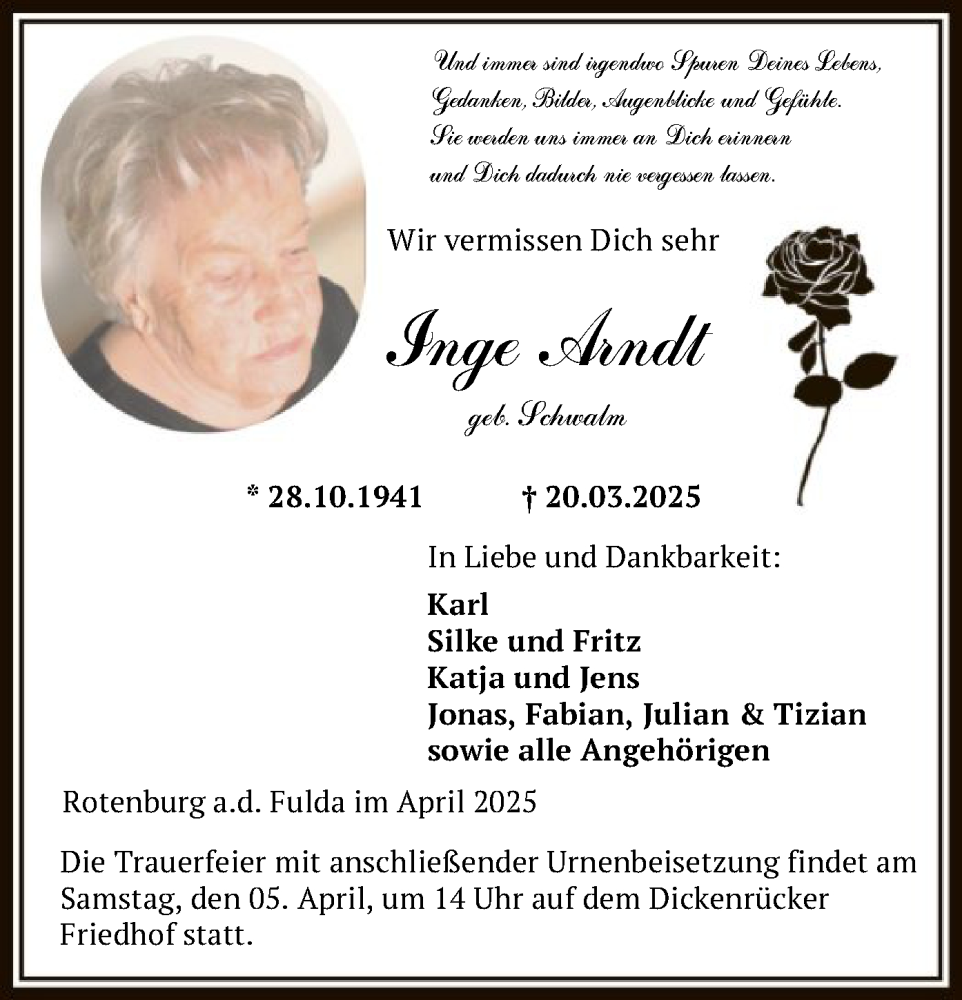 Hier finden Sie alle Traueranzeigen aus der Zeitung, die bisher für Inge Arndt erschienen sind. Weitere Traueranzeigen, die in der Zeitung erscheinen, werden hier ebenfalls aufgelistet
