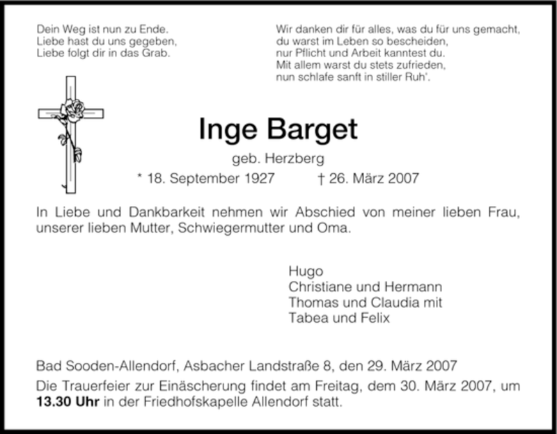 Hier finden Sie alle Traueranzeigen aus der Zeitung, die bisher für Inge Barget erschienen sind. Weitere Traueranzeigen, die in der Zeitung erscheinen, werden hier ebenfalls aufgelistet