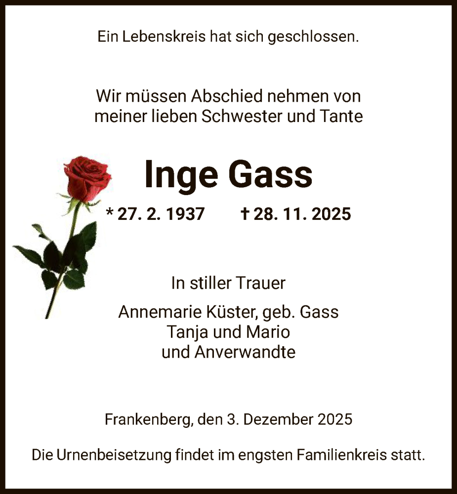 Hier finden Sie alle Traueranzeigen aus der Zeitung, die bisher für Inge Gass erschienen sind. Weitere Traueranzeigen, die in der Zeitung erscheinen, werden hier ebenfalls aufgelistet