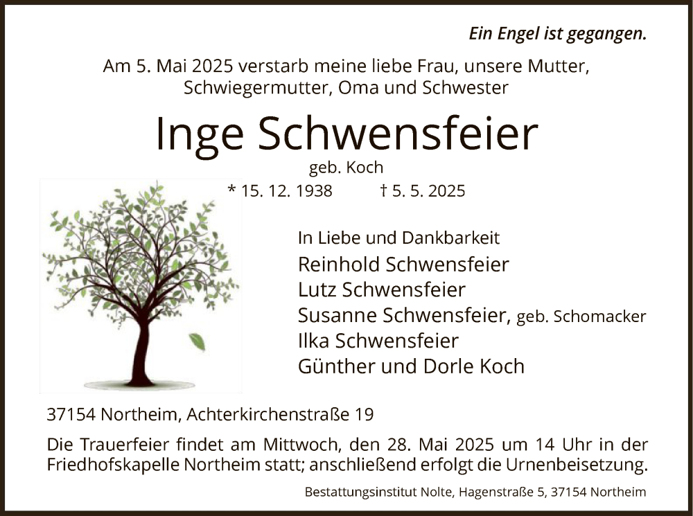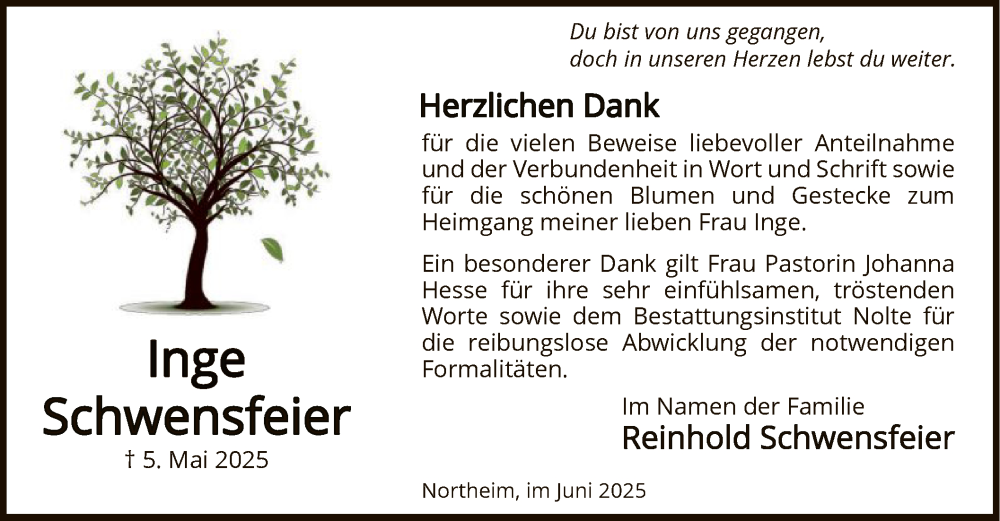 Hier finden Sie alle Traueranzeigen aus der Zeitung, die bisher für Inge Schwensfeier erschienen sind. Weitere Traueranzeigen, die in der Zeitung erscheinen, werden hier ebenfalls aufgelistet