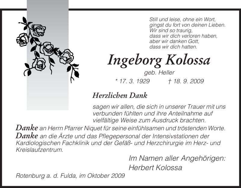 Hier finden Sie alle Traueranzeigen aus der Zeitung, die bisher für Ingeborg Kolossa erschienen sind. Weitere Traueranzeigen, die in der Zeitung erscheinen, werden hier ebenfalls aufgelistet