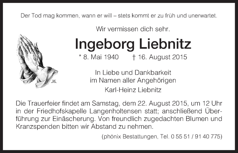 Hier finden Sie alle Traueranzeigen aus der Zeitung, die bisher für Ingeborg Liebnitz erschienen sind. Weitere Traueranzeigen, die in der Zeitung erscheinen, werden hier ebenfalls aufgelistet