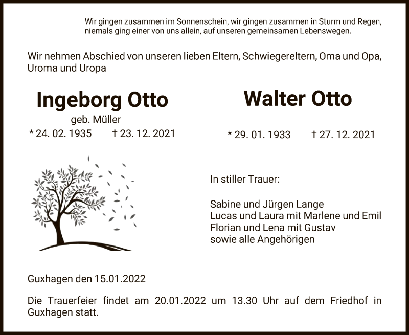 Hier finden Sie alle Traueranzeigen aus der Zeitung, die bisher für Ingeborg und Walter Otto erschienen sind. Weitere Traueranzeigen, die in der Zeitung erscheinen, werden hier ebenfalls aufgelistet
