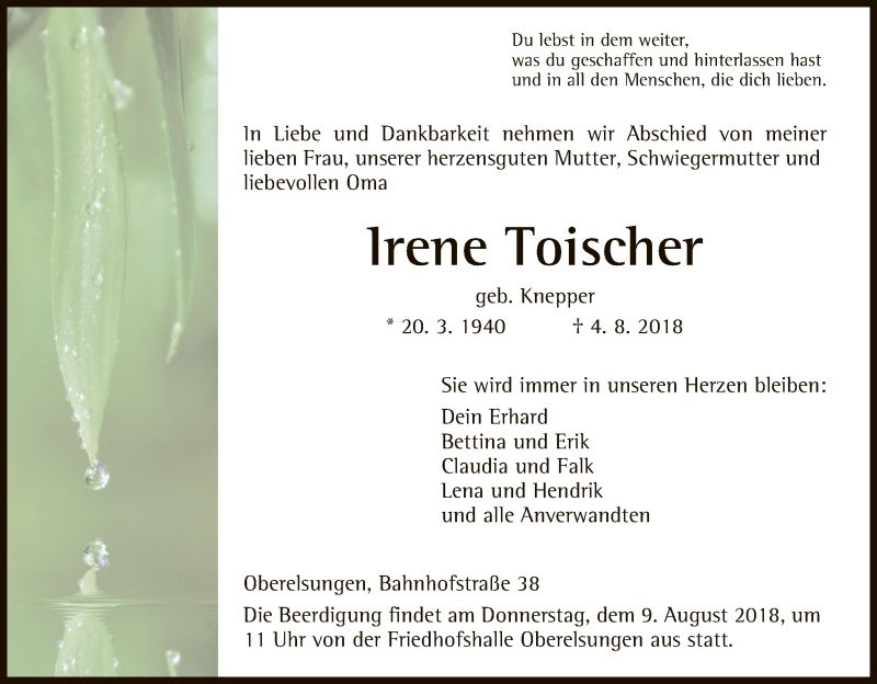 Hier finden Sie alle Traueranzeigen aus der Zeitung, die bisher für Irene Toischer erschienen sind. Weitere Traueranzeigen, die in der Zeitung erscheinen, werden hier ebenfalls aufgelistet