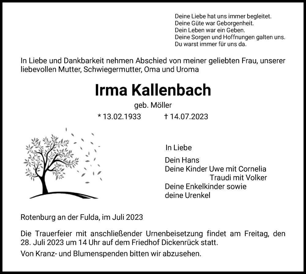 Hier finden Sie alle Traueranzeigen aus der Zeitung, die bisher für Irma Kallenbach erschienen sind. Weitere Traueranzeigen, die in der Zeitung erscheinen, werden hier ebenfalls aufgelistet