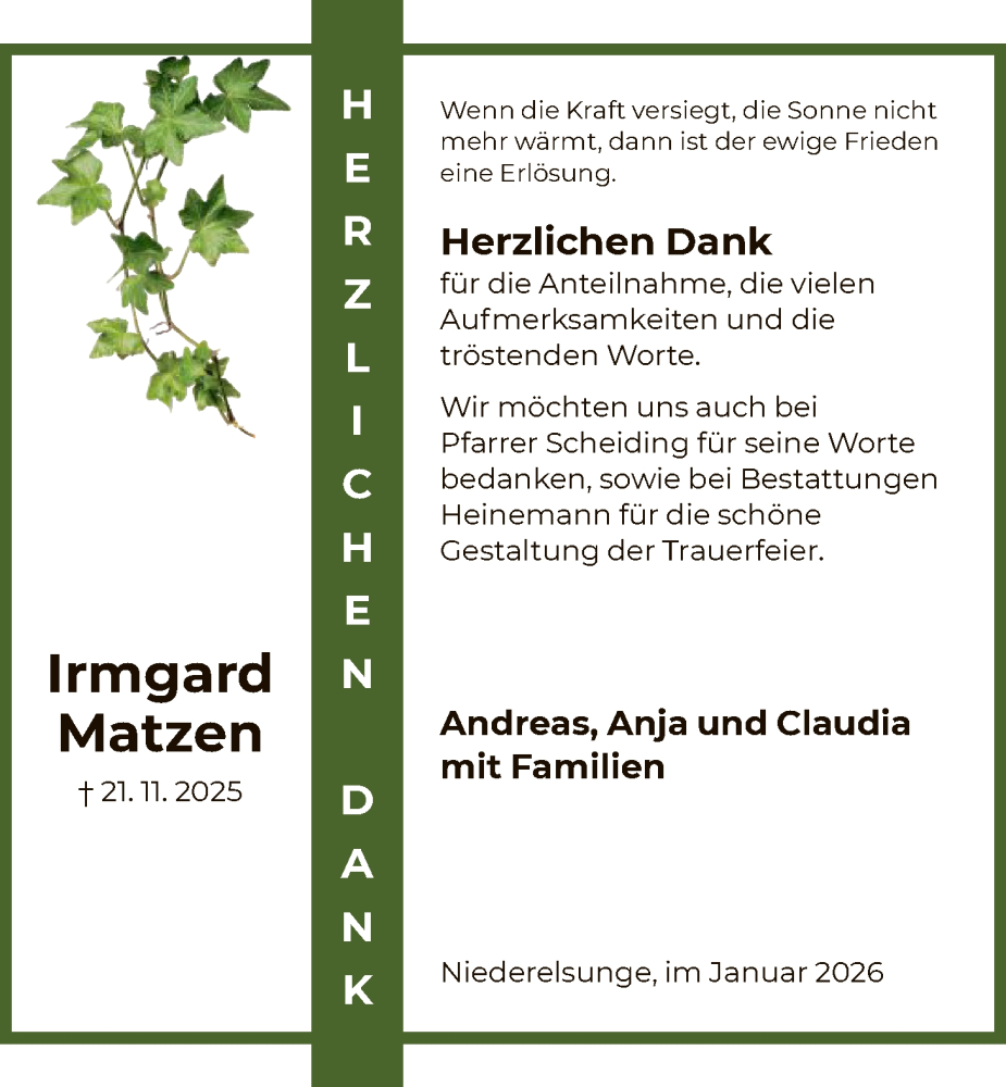 Hier finden Sie alle Traueranzeigen aus der Zeitung, die bisher für Irmgard Matzen erschienen sind. Weitere Traueranzeigen, die in der Zeitung erscheinen, werden hier ebenfalls aufgelistet