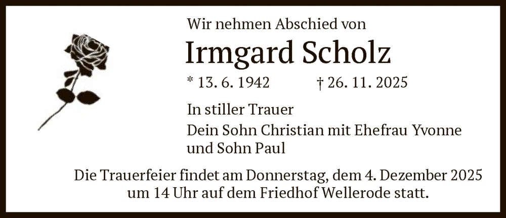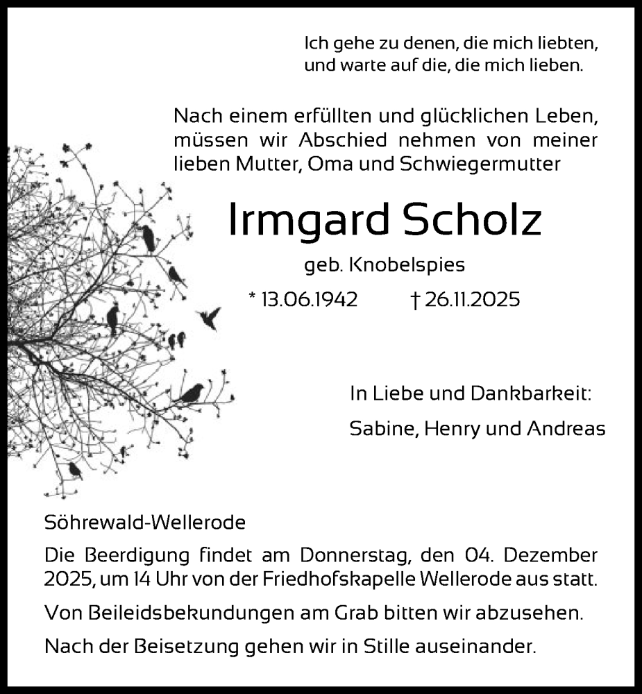 Hier finden Sie alle Traueranzeigen aus der Zeitung, die bisher für Irmgard Scholz erschienen sind. Weitere Traueranzeigen, die in der Zeitung erscheinen, werden hier ebenfalls aufgelistet