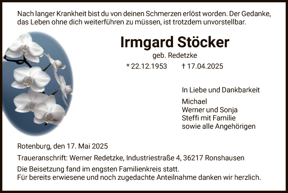 Hier finden Sie alle Traueranzeigen aus der Zeitung, die bisher für Irmgard Stöcker erschienen sind. Weitere Traueranzeigen, die in der Zeitung erscheinen, werden hier ebenfalls aufgelistet
