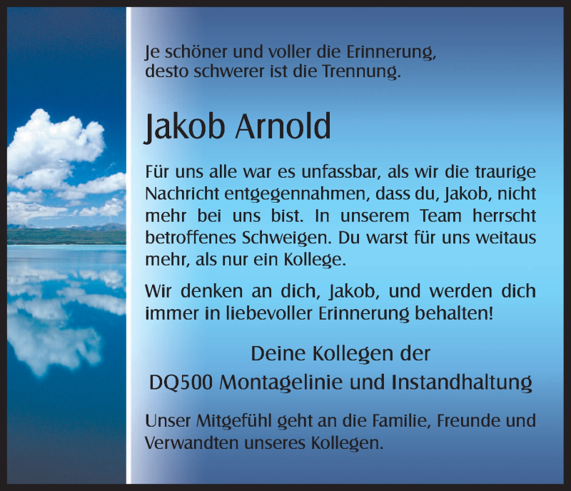 Hier finden Sie alle Traueranzeigen aus der Zeitung, die bisher für Jakob Arnold erschienen sind. Weitere Traueranzeigen, die in der Zeitung erscheinen, werden hier ebenfalls aufgelistet