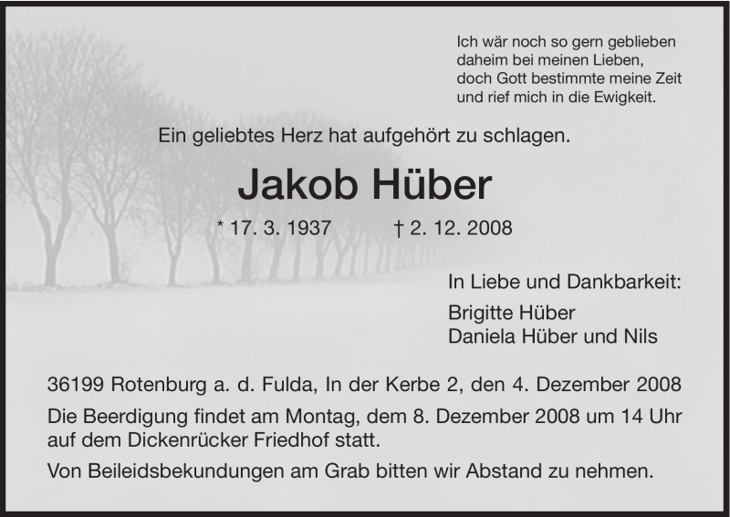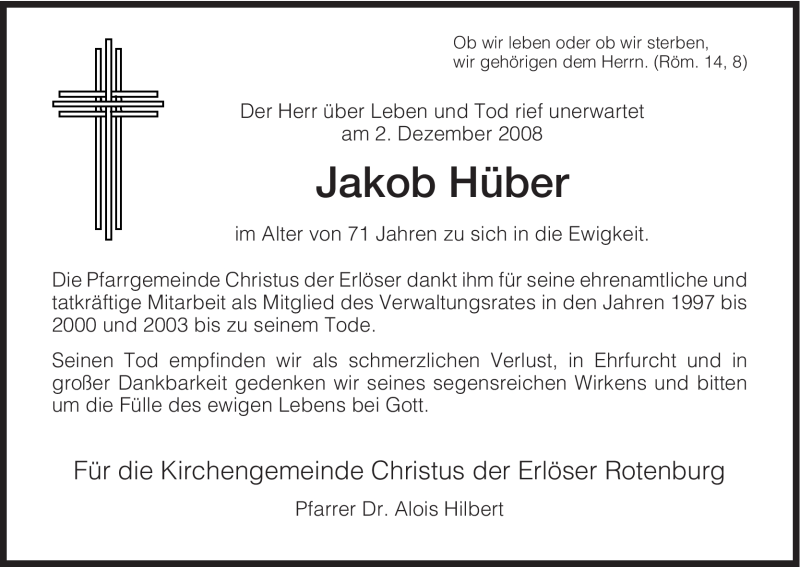 Hier finden Sie alle Traueranzeigen aus der Zeitung, die bisher für Jakob Hüber erschienen sind. Weitere Traueranzeigen, die in der Zeitung erscheinen, werden hier ebenfalls aufgelistet
