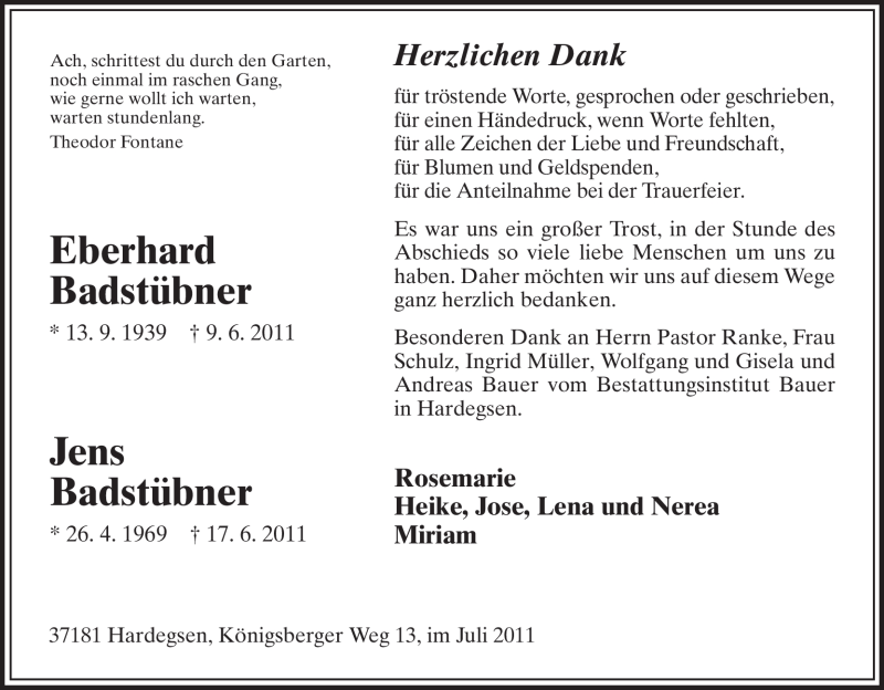 Hier finden Sie alle Traueranzeigen aus der Zeitung, die bisher für Jens Badstübner erschienen sind. Weitere Traueranzeigen, die in der Zeitung erscheinen, werden hier ebenfalls aufgelistet
