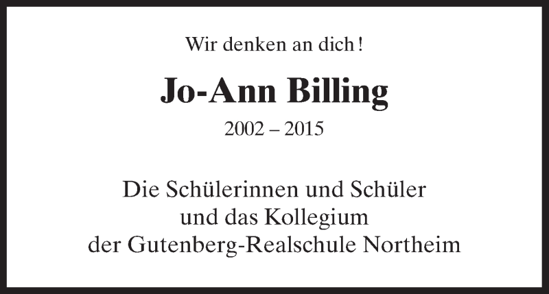 Hier finden Sie alle Traueranzeigen aus der Zeitung, die bisher für Jo-Ann Billing erschienen sind. Weitere Traueranzeigen, die in der Zeitung erscheinen, werden hier ebenfalls aufgelistet