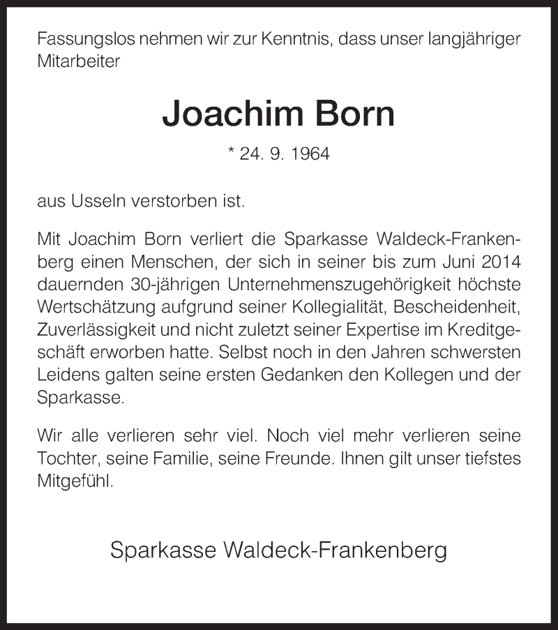 Hier finden Sie alle Traueranzeigen aus der Zeitung, die bisher für Joachim Born erschienen sind. Weitere Traueranzeigen, die in der Zeitung erscheinen, werden hier ebenfalls aufgelistet