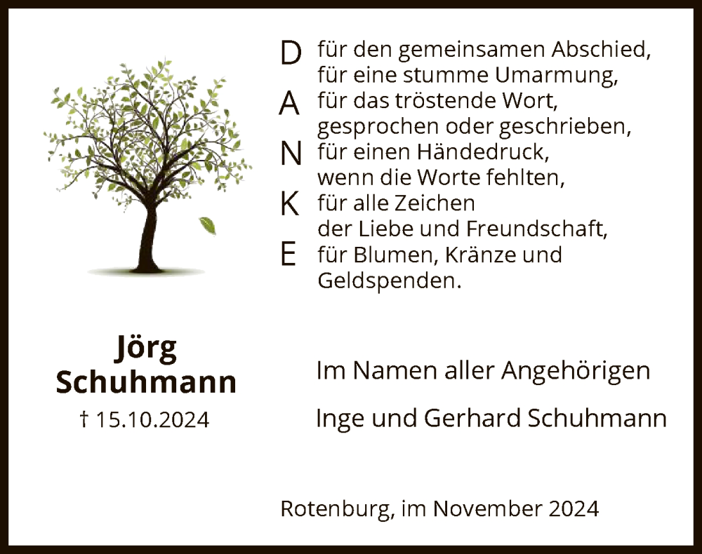 Hier finden Sie alle Traueranzeigen aus der Zeitung, die bisher für Jörg Schuhmann erschienen sind. Weitere Traueranzeigen, die in der Zeitung erscheinen, werden hier ebenfalls aufgelistet