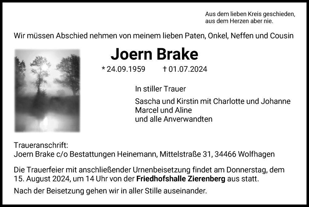 Hier finden Sie alle Traueranzeigen aus der Zeitung, die bisher für Joern Brake erschienen sind. Weitere Traueranzeigen, die in der Zeitung erscheinen, werden hier ebenfalls aufgelistet