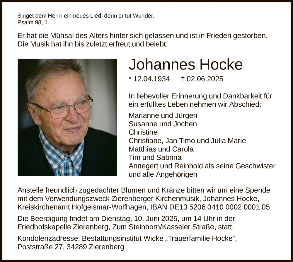 Hier finden Sie alle Traueranzeigen aus der Zeitung, die bisher für Johannes Hocke erschienen sind. Weitere Traueranzeigen, die in der Zeitung erscheinen, werden hier ebenfalls aufgelistet