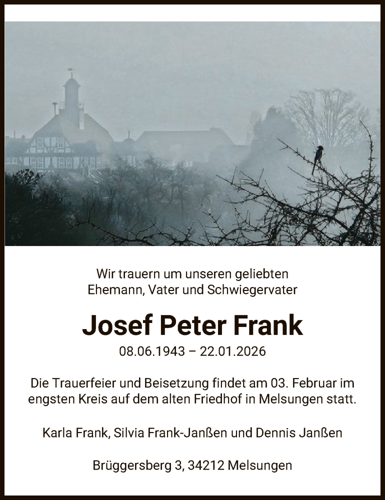 Hier finden Sie alle Traueranzeigen aus der Zeitung, die bisher für Josef Peter Frank erschienen sind. Weitere Traueranzeigen, die in der Zeitung erscheinen, werden hier ebenfalls aufgelistet