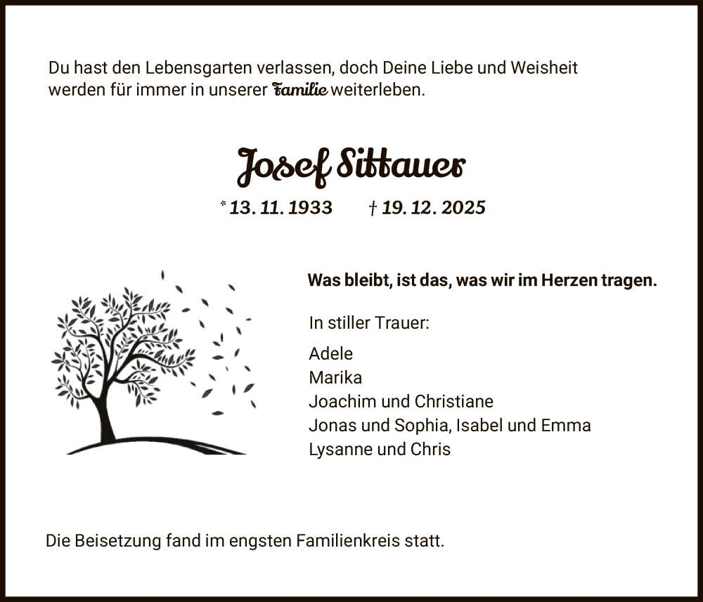 Hier finden Sie alle Traueranzeigen aus der Zeitung, die bisher für Josef Sittauer erschienen sind. Weitere Traueranzeigen, die in der Zeitung erscheinen, werden hier ebenfalls aufgelistet