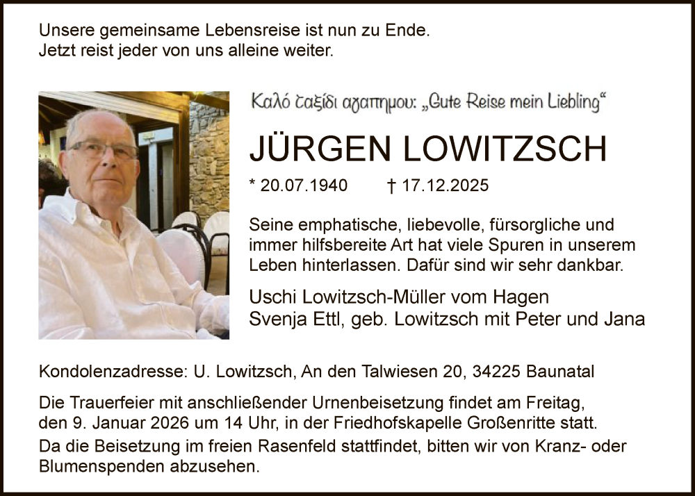 Hier finden Sie alle Traueranzeigen aus der Zeitung, die bisher für Jürgen Lowitzsch erschienen sind. Weitere Traueranzeigen, die in der Zeitung erscheinen, werden hier ebenfalls aufgelistet