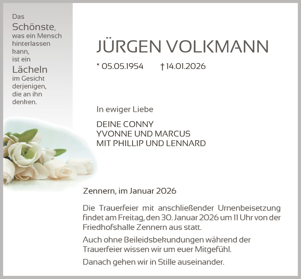 Hier finden Sie alle Traueranzeigen aus der Zeitung, die bisher für Jürgen Volkmann erschienen sind. Weitere Traueranzeigen, die in der Zeitung erscheinen, werden hier ebenfalls aufgelistet