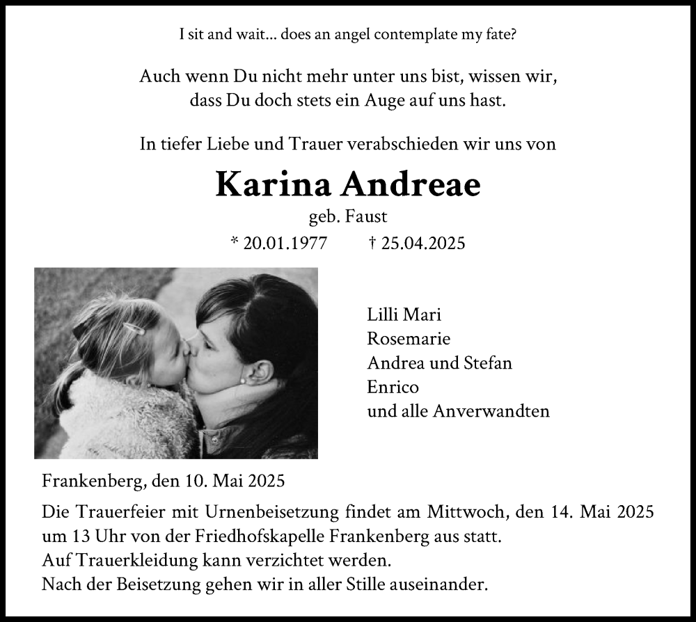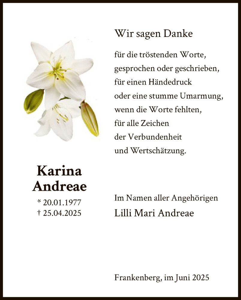 Hier finden Sie alle Traueranzeigen aus der Zeitung, die bisher für Karina Andreae erschienen sind. Weitere Traueranzeigen, die in der Zeitung erscheinen, werden hier ebenfalls aufgelistet