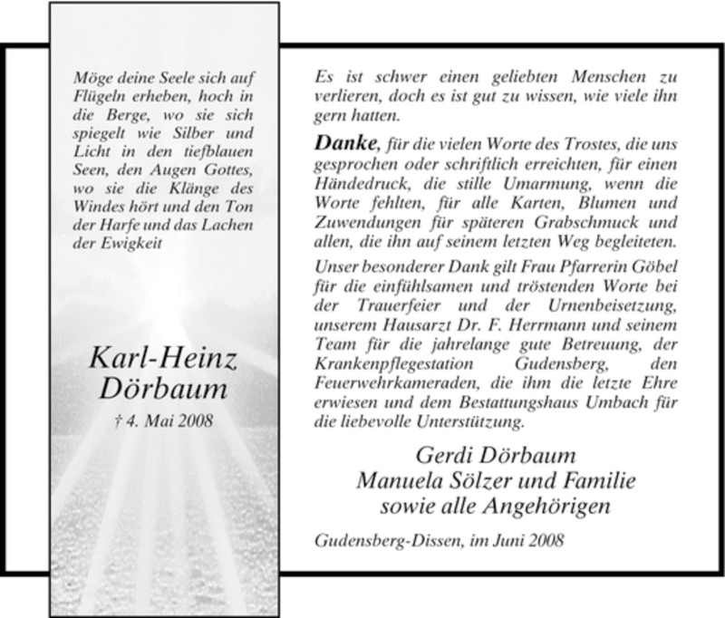 Hier finden Sie alle Traueranzeigen aus der Zeitung, die bisher für Karl-Heinz Dörbaum erschienen sind. Weitere Traueranzeigen, die in der Zeitung erscheinen, werden hier ebenfalls aufgelistet