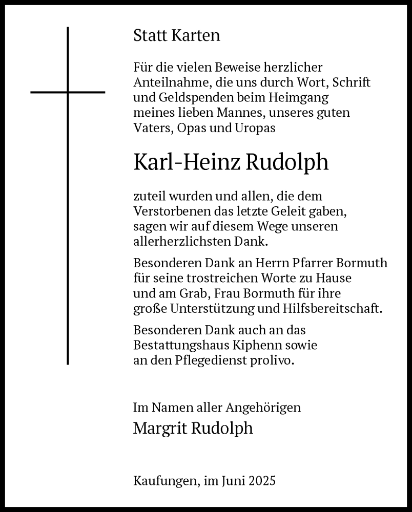 Hier finden Sie alle Traueranzeigen aus der Zeitung, die bisher für Karl-Heinz Rudolph erschienen sind. Weitere Traueranzeigen, die in der Zeitung erscheinen, werden hier ebenfalls aufgelistet